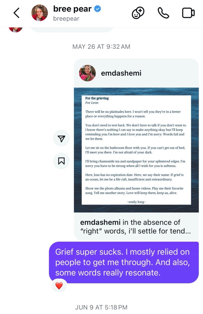 You probably don’t remember, but around this time last year, I sent you Emily’s For the Grieving poem (see cover photo screenshot). And yes, scrolling through our entire Insta DM history was a total time suck, but absolutely worth it for the picture proof.